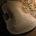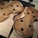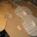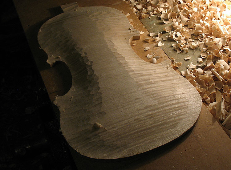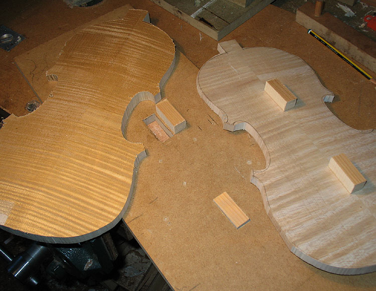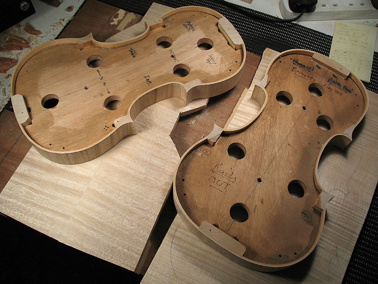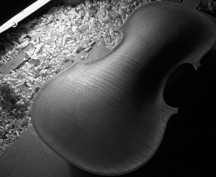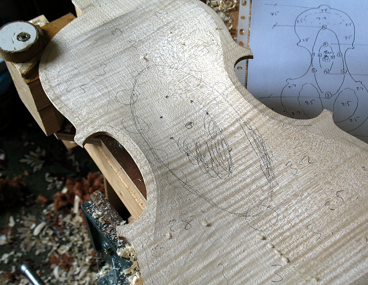 The Making of a Bergonzi violin 1 preparing the mould and blocks | 2 The Rib Garland | 3 Linings | 4 The back One thing I have never done - yet ! - is cut the button off when trimming the back. This of course is pretty terminal - but one can do a 'button graft' to reclaim your expensive wedge of wood. Once the back wedge, or one piece is dead flat on the inside face, one can then mark onto it the outline of your ribs that are still glued to the mould ( below 2 ) They are not released from the mould until the back is marked. I mark them with a small washer which rolls around the edge - and a sharp but not too hard pencil. I also scribe a scratch line around the actual rib edge, which is a good back up as it does not rub off. The centre join is carefull aligned with the centre line of the upper and lower blocks. Once marked the plate is roughed around on the bandsaw - WITHOUT cutting off the button, which at this stage is left rough and oversized. I don't cut too closely to the line as I seldom change the bandsaw blade for anything smaller than 1/2" - 4 skip tooth - which is pretty coarse. Once roughed - I glue on my locating blocks that hold the plate firmly on a board ( 4 ) - then rough gouge down to the edges and corners, essentially reducing the plate around the final edge area to about 6mm maybe.( 1 ) I then rough the plate all over with a seriously large handled gouge (one I can fit on my hip ! ) - once its sort of looking like a violin plate - I will then trim the edge. I do this now with just a small plane and a knife for the tight curves. Its trimmed just to the line - but the corners are left oversized. Its now a case of reducing the outside profile down to a finished shape. I purfle the edge after the body has been closed up, so the sinking around the edge is not finalised untill then. It needs to be sunk partially though - or its very difficult to control the arch form. This often means I am marking purfling onto a sloping edge, which you have to get used to. The advantage is that I don't have to worry about the final overhang too much, or the corner shape. These are trimmed to meet the ribs. Once I am happy with both the long and cross archings - and the edge thickness, then the plate is turned over for thickessing. I support the plate for thicknesing in a holder (5), that also serves as a finished instrument holder - either belly up or down with neck set etc. It adjusts for any size up to a large viola. I do not like to have the plate supported while thicknessing. I can then feel under with my fingers as I work the plate. Once there is some 'give' you are close. Just my way of doing things ! The thinkness of back and top are again a matter of great debate. Some would have you believe that they must be tuned to certain core frequencies - very similar to those learned religious men of old who sorted out how many 'angels were on pinheads' ! Some go by weight - fretting if they cannot get the back under 100 gms. Flex - tap tap - !!! The truth is the thicknesses of these old instruments are all over the place - so i don't think the old guys did anything too technical outside of 'feeling it'. Actually, thats pretty technical if you have brains in your hands ! I do not follow to the letter the measured thicknesses on an instrument. I think it is something one has to do 'your way' one each violin you build. Let your hands tell you its done. Many things in violin making are like that. Old makers did not force things - they worked with an old style craftsmans grace. They thought more with their muscles than their heads. The back is fairly straightfoward. As someone said - 'the back is for show, the top is for go'. |