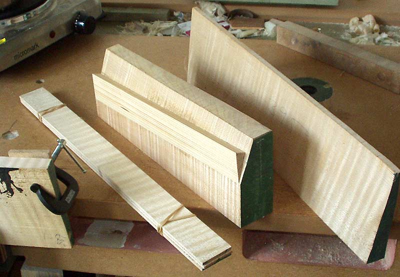 They all start out like this on my bench - wedges of tonewood. These are very old Bosnian maple. The side fillet ont he neck block squares things up to facilitate marking out the pattern - it is then carved away.