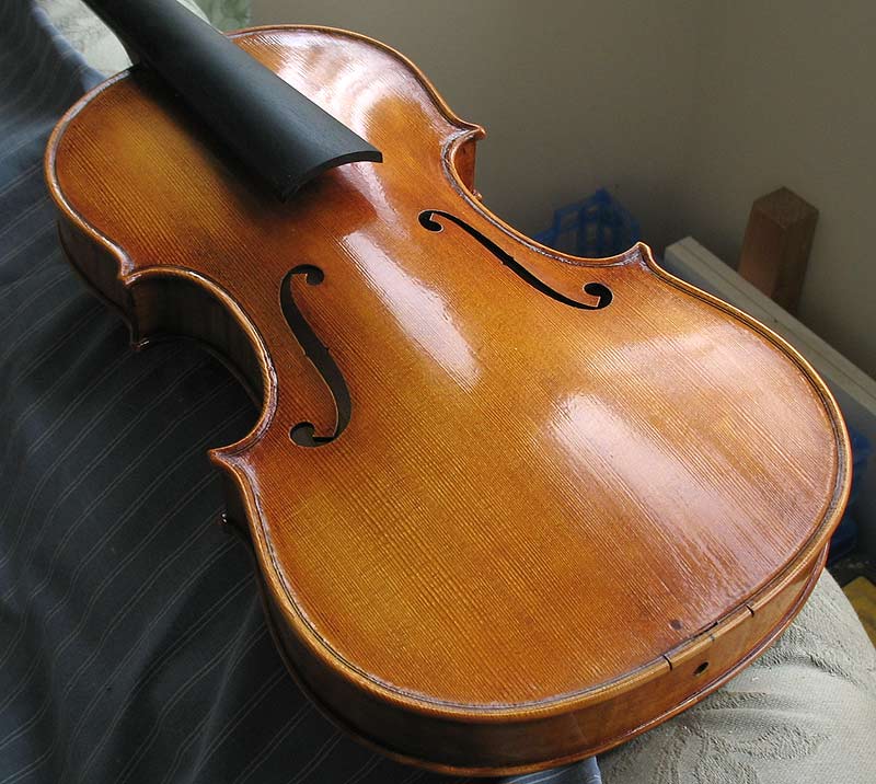 A Guarneri violin - awaiting set up. Note the saddle mortice is cut but left in. The colour here is a combination of the very dark cooked rosin varnish, my own madder lake and a bit of blue and yellow.