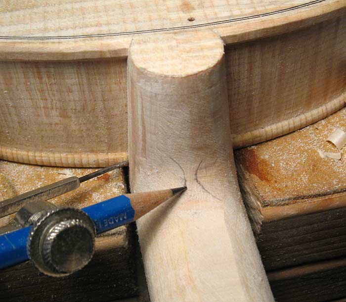 Roughing out the neck. Marking the heel distance from the plate edge - 27mm for viola. Scraping and finishing the neck takes a while until it 'feels sweet' when handled in the playing position.