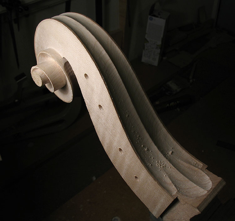 The Guagagnini cello scroll - fluting he back. The undercut of the scroll volute is gouged in from the side - then worked