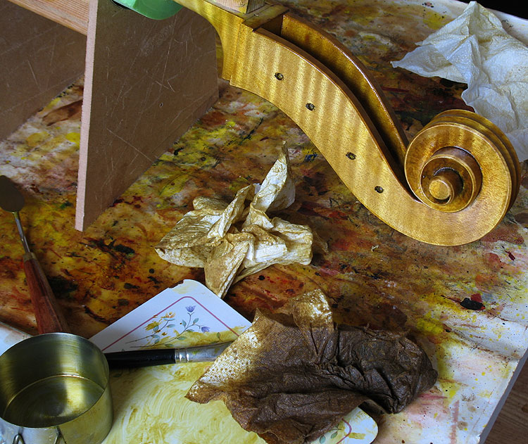 The Guadagnini cello scroll. Ist coat after the ground - trans yellow and cassel earth pigment.